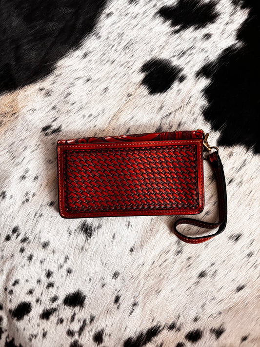 Cartera artesanal con cincelado en flor, bordado y tejido en petatillo